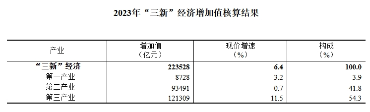 经核算,2023年我国“三新”经济增加值为223528亿元,比上年增长6.4%(按现价计算,下同),比同期国内生产总值(GDP)现价增速高1.8个百分点;相当于GDP的比重为17.73%,比上年提高0.37个百分点。